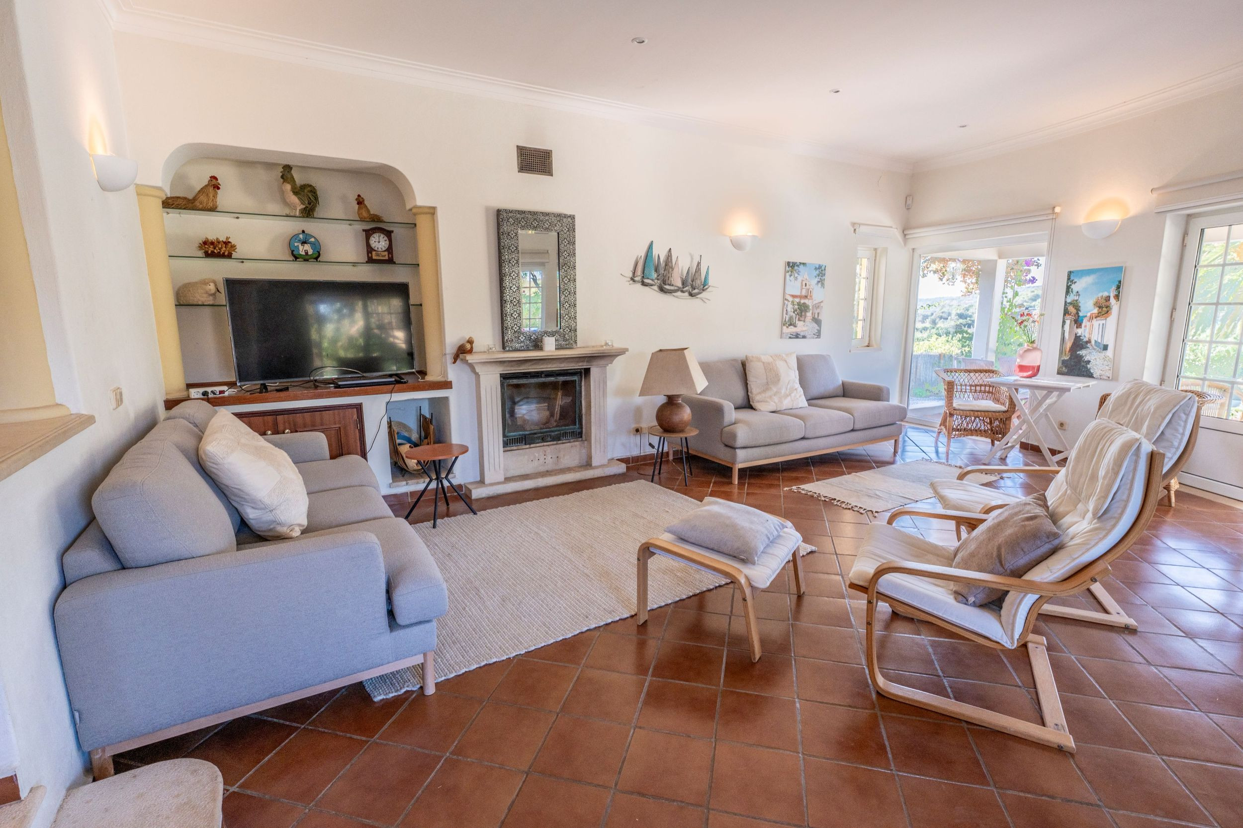 Lounge with fireplace opening onto a covered terrace with pool and garden views
